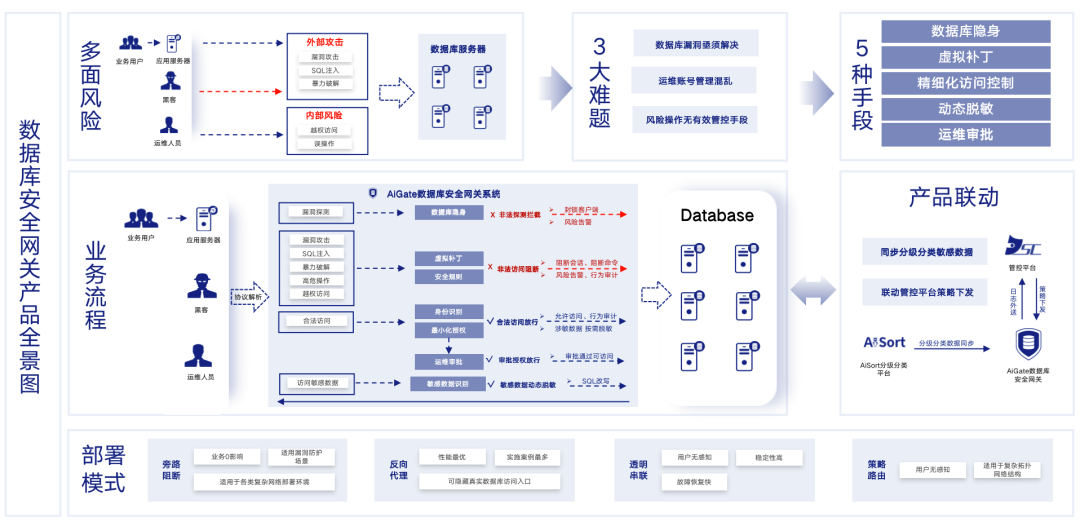 為了解決以上數(shù)據(jù)庫(kù)安全建設(shè)面臨的挑戰(zhàn),安恒信息為該醫(yī)院客戶推薦了安恒AiGate數(shù)據(jù)庫(kù)安全網(wǎng)關(guān)系統(tǒng)(以下簡(jiǎn)稱AiGate)。AiGate是安恒信息在多年數(shù)據(jù)安全訪問(wèn)控制理論和實(shí)踐經(jīng)驗(yàn)積累的基礎(chǔ)上,集數(shù)據(jù)庫(kù)準(zhǔn)入、訪問(wèn)控制、攻擊防護(hù)、動(dòng)態(tài)脫敏、 運(yùn)維審批等多種功能一體的產(chǎn)品。目前,該產(chǎn)品已在多個(gè)行業(yè)被廣泛應(yīng)用,保障著用戶的重要數(shù)據(jù)和敏感信息。