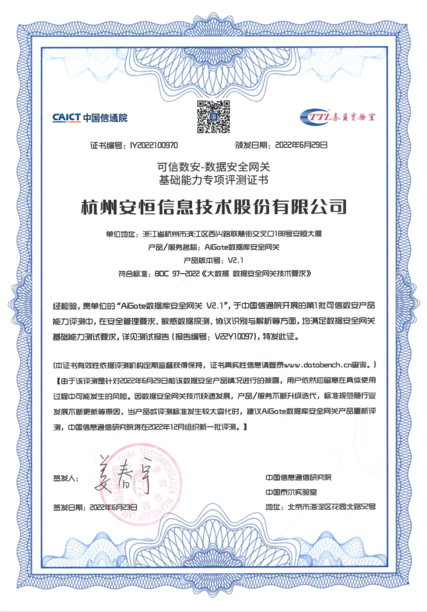 安恒AiGate數(shù)據(jù)庫(kù)安全網(wǎng)關(guān)之所以能得到客戶的廣泛認(rèn)可,離不開安恒信息多年數(shù)據(jù)庫(kù)安全訪問(wèn)控制理論和實(shí)踐經(jīng)驗(yàn)積累。AiGate集成了安恒信息市場(chǎng)領(lǐng)先的數(shù)據(jù)庫(kù)協(xié)議解析技術(shù),并在多年現(xiàn)場(chǎng)實(shí)戰(zhàn)中不斷打磨沉淀真實(shí)客戶場(chǎng)景,鉆研有效實(shí)用的安全策略,為客戶打造出了全方位的數(shù)據(jù)庫(kù)安全防護(hù)體系。AiGate更是在去年首批通過(guò)信通院“數(shù)據(jù)安全網(wǎng)關(guān)”專項(xiàng)評(píng)測(cè),在安全管理要求、敏感數(shù)據(jù)探測(cè)、協(xié)議識(shí)別與解析方面均達(dá)到認(rèn)證標(biāo)準(zhǔn)。