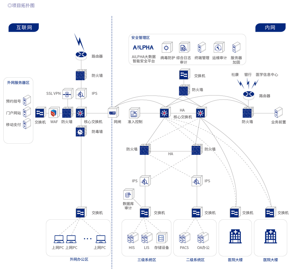 深圳某醫(yī)院的HIS、LIS、PACS、OA等系統(tǒng)是本單位信息化管理的重要組成部分,根據(jù)《信息安全等級(jí)保護(hù)建設(shè)指南》,HIS系統(tǒng)和LIS系統(tǒng)定為三級(jí),PACS和OA系統(tǒng)定為二級(jí),整體網(wǎng)絡(luò)按照三級(jí)要求進(jìn)行安全建設(shè)。結(jié)合某醫(yī)院的實(shí)際情況,從技術(shù)、管理、服務(wù)三個(gè)層面,對(duì)HIS、PACS和OA等核心業(yè)務(wù)系統(tǒng)的安全進(jìn)行整改和建設(shè),形成完善的等級(jí)保護(hù)安全保障體系,以符合國(guó)家衛(wèi)健委和深圳市衛(wèi)健委對(duì)三甲醫(yī)院信息化等級(jí)保護(hù)工作的要求。