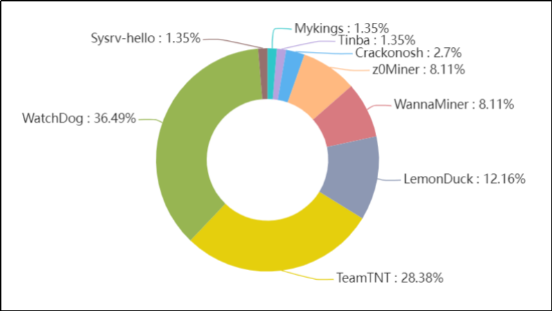 據(jù)安恒威脅情報(bào)中心監(jiān)測(cè)數(shù)據(jù)顯示,2021年國(guó)內(nèi)外挖礦木馬家族總量做多的是WatchDog家族,占總量的36.9%,其次是TeamTNT家族,占總量的28.38%,然后是LemonDuck家族,占總量的12.16%。