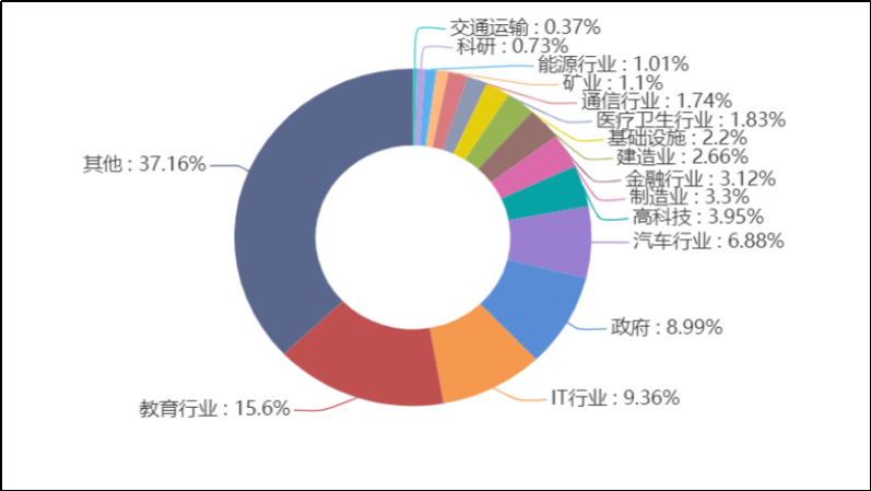 國(guó)內(nèi)挖礦感染數(shù)量行業(yè)分布情況如下圖所示,主要受害行業(yè)以教育行業(yè)為主,其次是IT行業(yè)和政府。