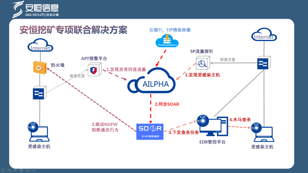 方案以AiLPHA大數(shù)據(jù)智能安全平臺(tái)為中心,依托于深耕多年的安全事件分析引擎,配合APT、AiNTA等探針全面的攻擊檢測(cè)能力,對(duì)全網(wǎng)流量進(jìn)行深度解析,對(duì)關(guān)鍵區(qū)域惡意文件分析數(shù)據(jù)以及全網(wǎng)各安全設(shè)備告警日志進(jìn)行集中收集、治理、分析、存儲(chǔ),精準(zhǔn)定位挖礦程序以及挖礦行為。