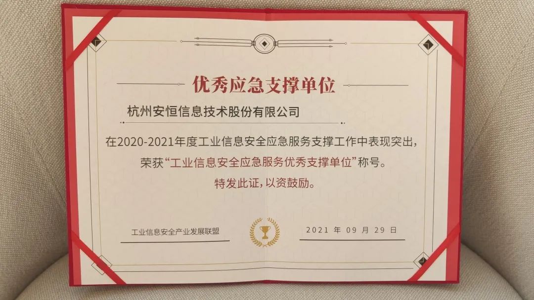 2020-2021年度工業(yè)信息安全應(yīng)急服務(wù)優(yōu)秀支撐單位證書