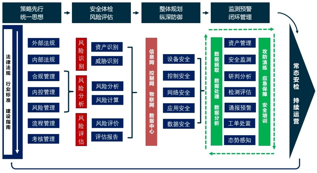在滿足企業(yè)建立的標準規(guī)范的基礎(chǔ)上,根據(jù)前期對企業(yè)開展風(fēng)險評估掌握的實際情況,以及明確企業(yè)安全保障目標的前提下,從“設(shè)備安全、控制安全、網(wǎng)絡(luò)安全、應(yīng)用安全和數(shù)據(jù)安全”五大角度,為企業(yè)建立縱深防御體系,制定整體規(guī)劃的實施路線圖,確保在各場景下的安全防護能力。