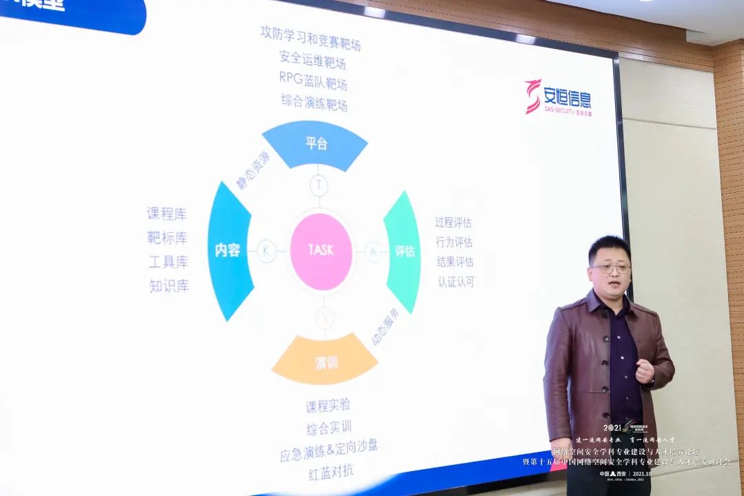 苗春雨又從企業(yè)角度出發(fā),分享了安恒信息網(wǎng)絡(luò)安全人才的培養(yǎng)框架——TASK模型。TASK模型由任務(wù)、評估、技能、知識四個維度組成,根據(jù)工作崗位主要任務(wù),提煉崗位應(yīng)用的技術(shù)、必備知識,在安全運維、綜合演練等網(wǎng)絡(luò)安全靶場中評估和認證,依托模型體系培養(yǎng)實戰(zhàn)能力強、綜合素質(zhì)高的網(wǎng)絡(luò)安全人才。