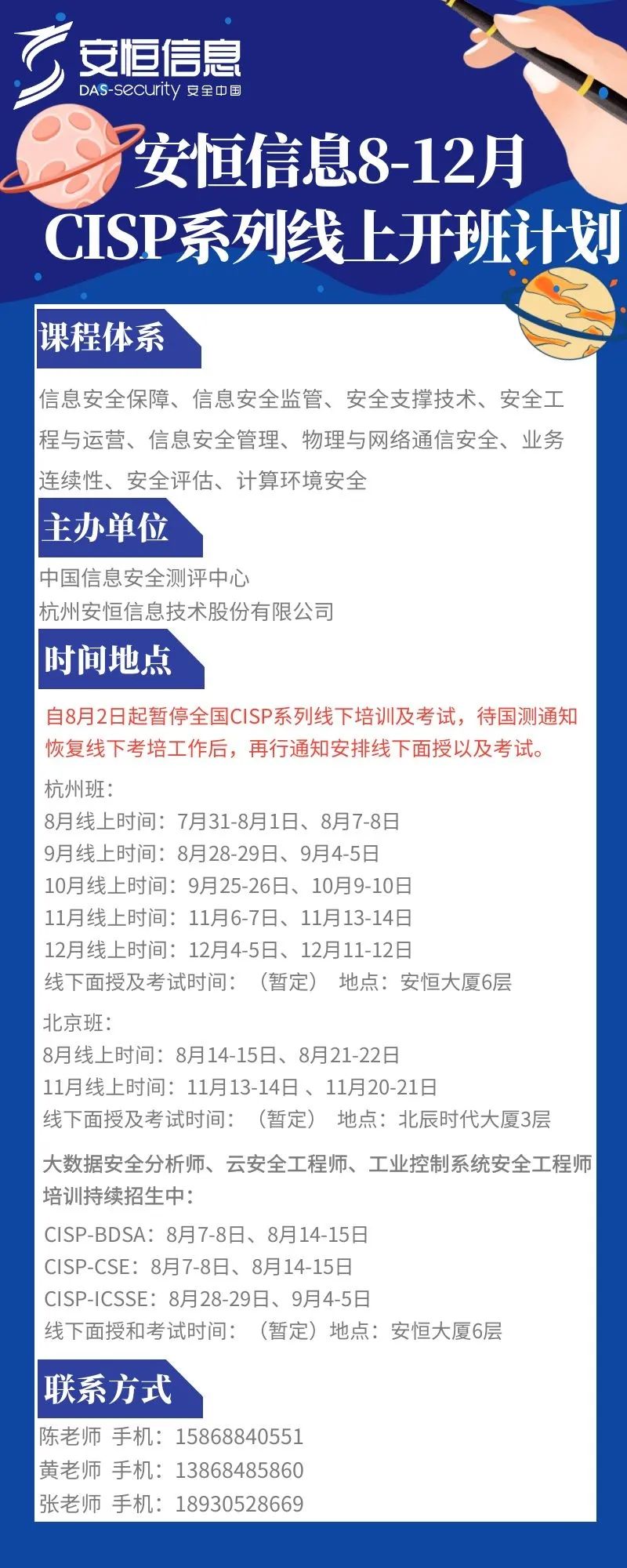 受疫情影響,自8月2日起,全國(guó)暫停CISP線下培訓(xùn)及考試,待中國(guó)信息安全測(cè)評(píng)中心通知恢復(fù)線下考培工作,再行通知安排線下面授及考試。線上培訓(xùn)照常進(jìn)行,詳情見(jiàn)下文海報(bào)~