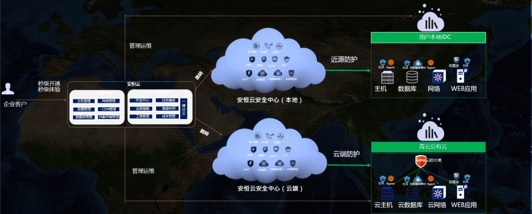 基于青云的公有云和用戶本地的IDC,通過安恒云安全中心,實(shí)現(xiàn)安全能力集中化,聯(lián)動(dòng)安全產(chǎn)品,云安全統(tǒng)一管控,數(shù)據(jù)統(tǒng)一收集,保障公有云、私有云統(tǒng)一防護(hù)。