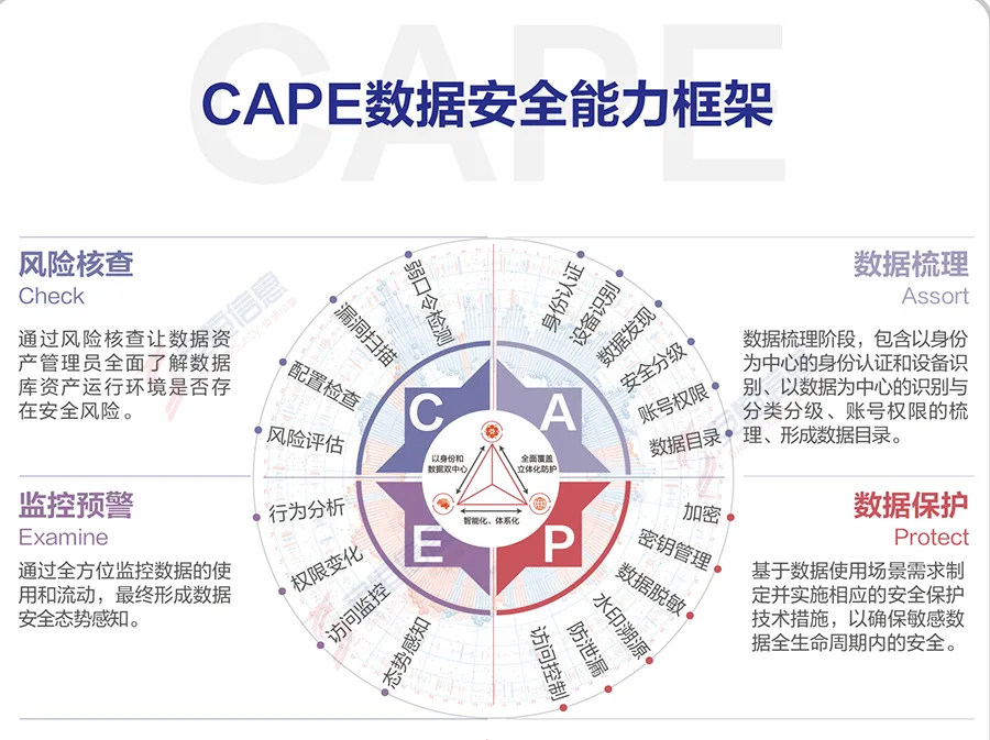而后,他向大家介紹了安恒信息率先提出的CAPE模型。綜合現(xiàn)有數(shù)據(jù)安全治理模型以及豐富的信息安全領(lǐng)域項(xiàng)目實(shí)戰(zhàn)經(jīng)驗(yàn),CAPE模型針對(duì)敏感數(shù)據(jù)保護(hù)構(gòu)建了“風(fēng)險(xiǎn)核查Check—數(shù)據(jù)梳理Assort—數(shù)據(jù)保護(hù)Protect—監(jiān)控預(yù)警Examine”這一技術(shù)思路,堅(jiān)持以身份和數(shù)據(jù)雙中心、全面覆蓋立體化防護(hù)、智能化、體系化三大原則,可幫助更多企業(yè)從技術(shù)角度避免很多數(shù)據(jù)安全問(wèn)題的發(fā)生。