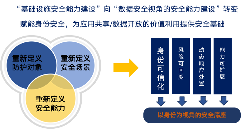 零信任并不是要顛覆等保2.0、縱深防御體系,而是互補關系。零信任以身份為新邊界,意味著首先要改變的是僅依賴安全設備在網絡邊緣保護所有系統(tǒng)和資源的情況,需要在用戶現網的架構中,重新定義防護對象、新業(yè)務安全場景、并交付新的安全能力。我們要根據系統(tǒng)本身的安全策略、業(yè)務敏感度、安全等級特征等因素,建立新的身份邊界。這里的“身份”不僅是用戶的身份,還要考慮訪問主體和客體的身份(如設備、應用等)、原有的網絡的身份等。可以看到,我們并沒有摒棄傳統(tǒng)的以網絡為安全邊界的理念,而是又疊加了多維度的身份信息,以軟件定義的方式構建以身份為邊界的新安全模式。