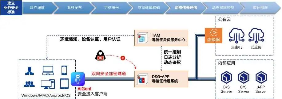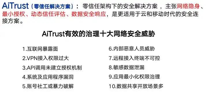 安恒信息依靠多年的技術沉淀和秉持創(chuàng)新精神,推出AiTrust零信任解決方案,該方案取代了以邊界為中心的安全架構,它可確保根據身份、設備和用戶環(huán)境動態(tài)實施安全和訪問決策。只有經過身份驗證和授權的用戶和設備才能訪問應用程序和數據。精準交付網絡隱身、最小權限、動態(tài)信任評估及數據安全保障等多項安全能力。