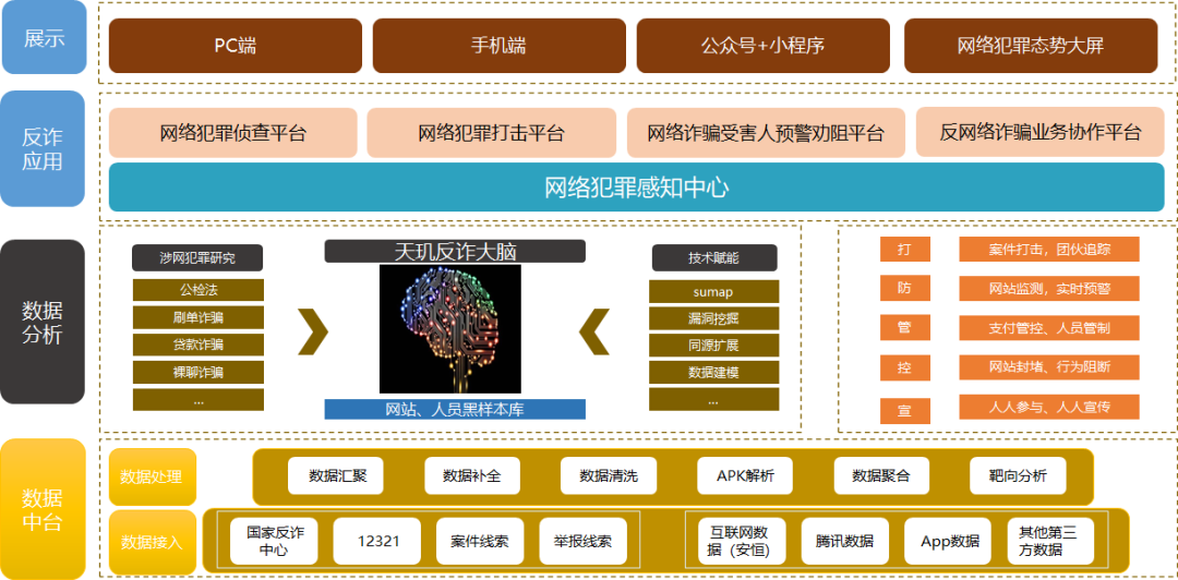 方案以網(wǎng)站封堵和潛在受害者精準(zhǔn)識別預(yù)警為核心,構(gòu)建全民參與、警企合作、部門協(xié)調(diào)的打防管控宣一體化的反詐平臺,最終實(shí)現(xiàn)對轄區(qū)網(wǎng)絡(luò)詐騙的打、防、管、控、宣。