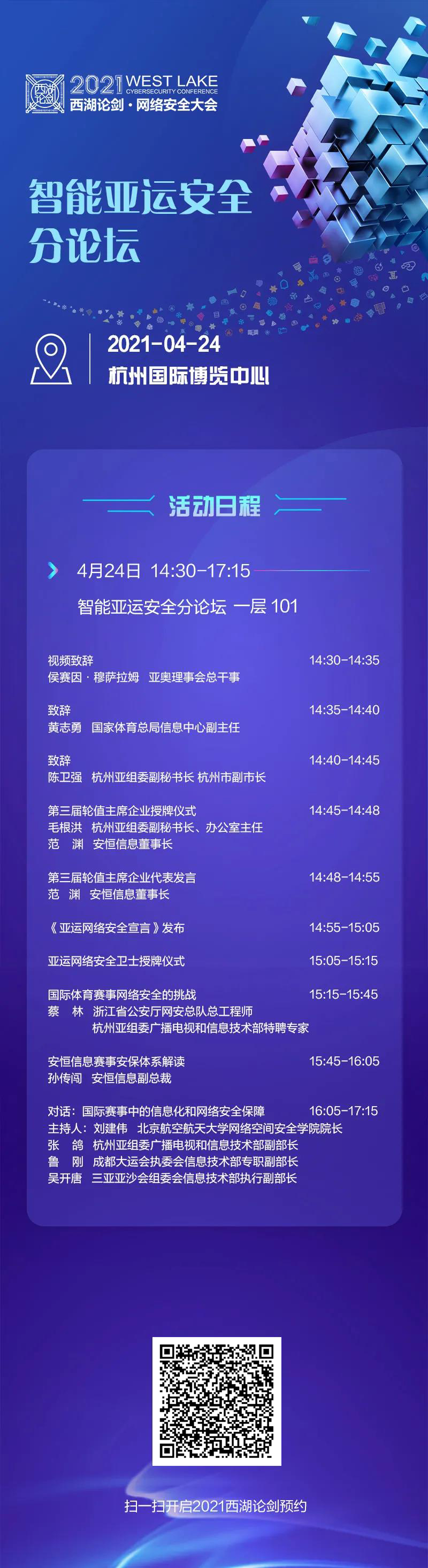 2021年4月24日,2021西湖論劍?網(wǎng)絡(luò)安全大會(huì)新增智能亞運(yùn)安全分論壇,這是首個(gè)聚焦賽事網(wǎng)絡(luò)安全服務(wù)的盛會(huì),邀請(qǐng)了國(guó)內(nèi)外知名專家為亞運(yùn)網(wǎng)絡(luò)安全建言獻(xiàn)策。在現(xiàn)場(chǎng),將由亞奧理事會(huì)總干事遠(yuǎn)程視頻連線致辭。