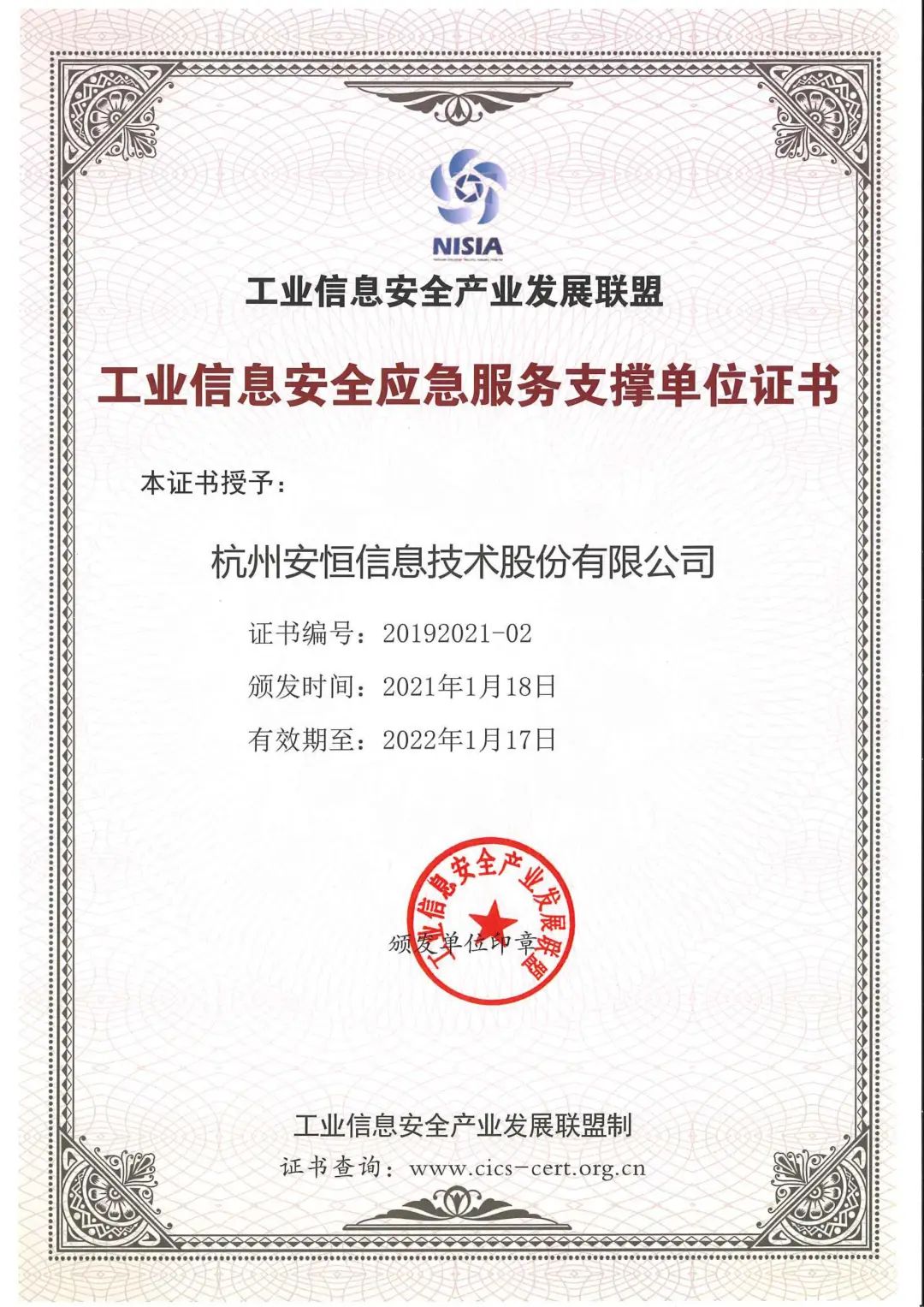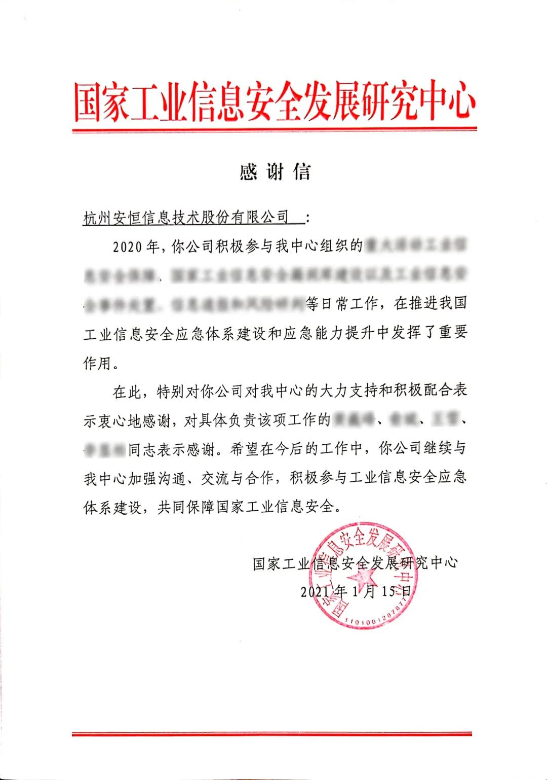 榮耀二連!安恒信息連續(xù)兩年收到「國家工業(yè)信息安全發(fā)展研究中心」感謝信