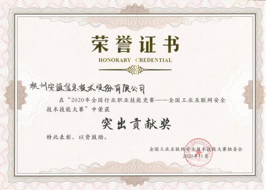 2020年11月6日,獲工信部、人社部、全國總工會、共青團(tuán)中央聯(lián)合主辦的全國工業(yè)互聯(lián)網(wǎng)安全技術(shù)技能大賽突出貢獻(xiàn)獎;