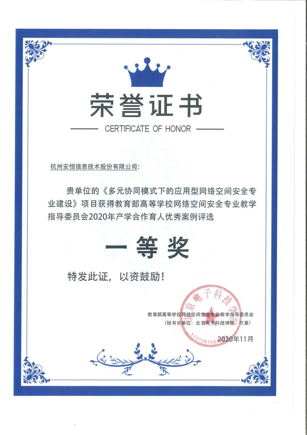 2020年11月24日,獲教育部高等學(xué)校網(wǎng)絡(luò)空間安全專業(yè)教學(xué)指導(dǎo)委員會2020年產(chǎn)學(xué)合作育人優(yōu)秀案例評選一等獎。