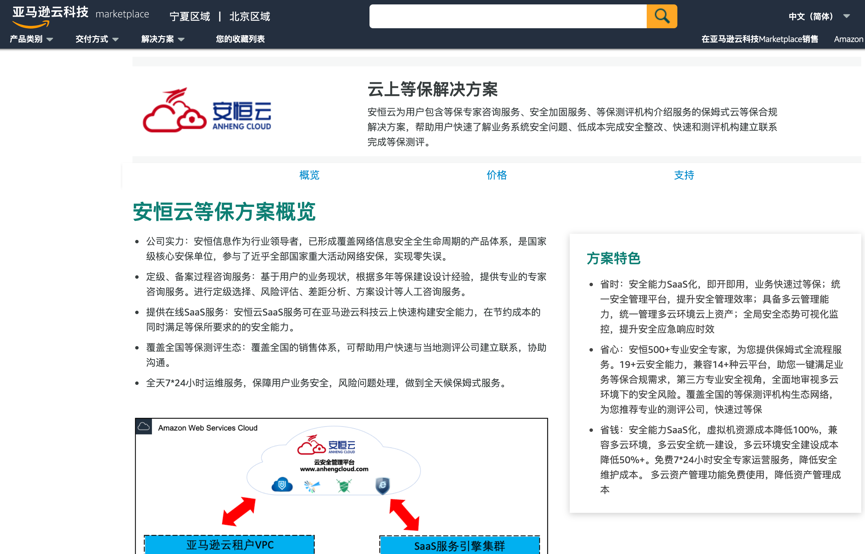 自2019年起,安恒信息云安全與亞馬遜科技展開全面合作,2021年,安恒云在線SaaS訂閱服務(wù)入駐亞馬遜科技marketplace,是首批入駐的SaaS解決方案,也是唯一一個SaaS云安全解決方案。安恒云等保解決方案也是亞馬遜marketplace等保2.0解決方案推薦解決方案之一。
