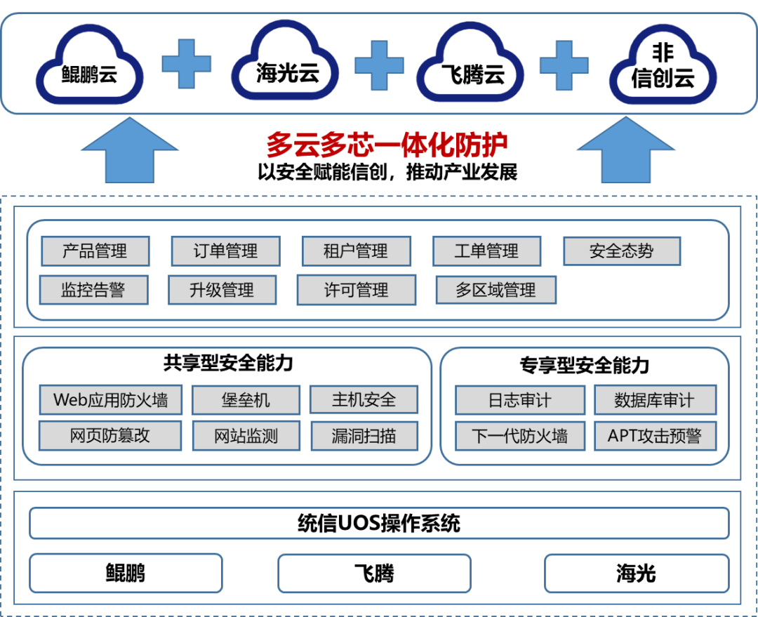 面對信創(chuàng)環(huán)境下特有的“多云多芯”的業(yè)務環(huán)境,安恒信息基于多年以來對云安全的技術沉淀和行業(yè)積累,于2020年率先發(fā)布面向多云環(huán)境的云安全戰(zhàn)略,并通過信創(chuàng)云安全解決方案對“X86+信創(chuàng)”的多云多芯環(huán)境進行完美覆蓋。