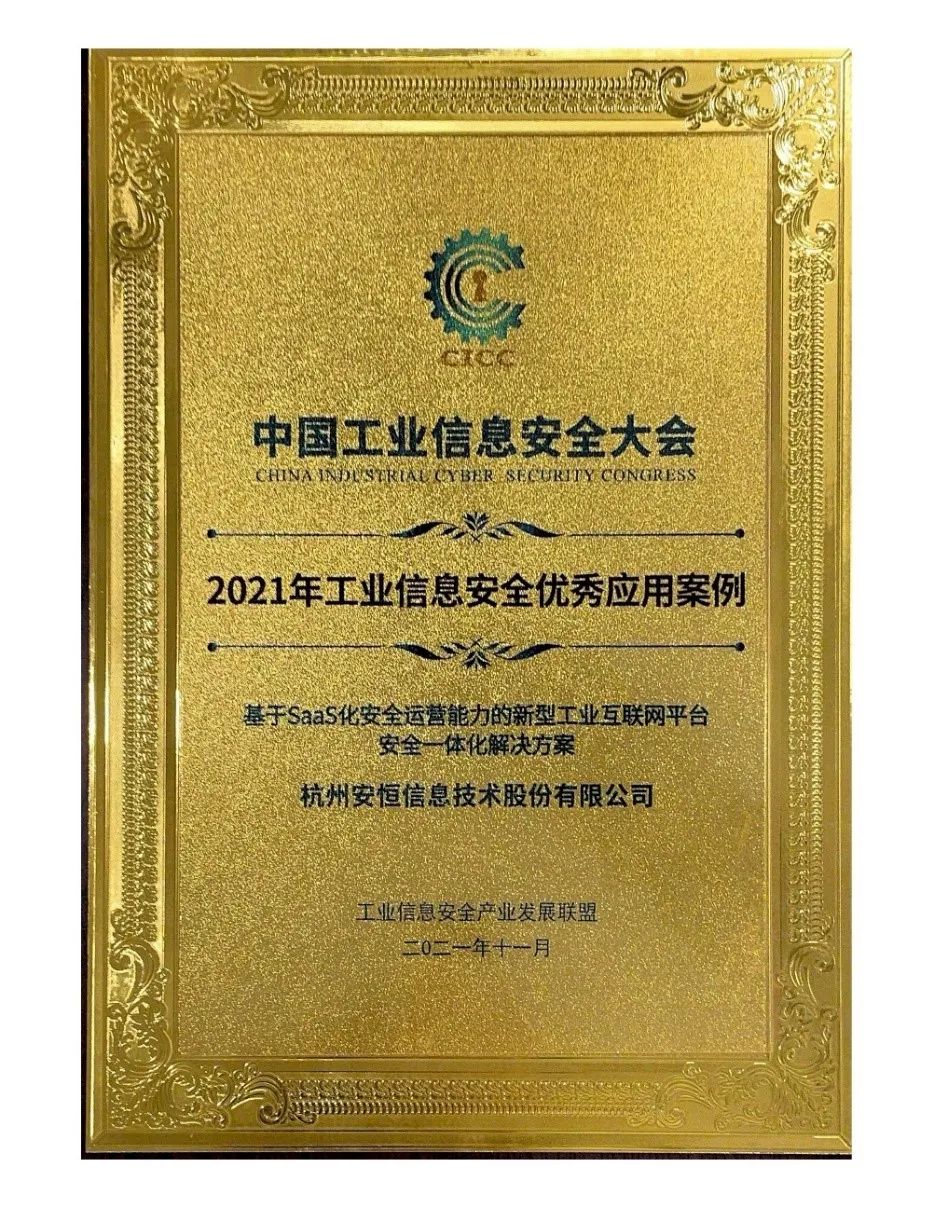 在本年度案例征集展示活動中,安恒信息“基于SaaS化安全運營能力的新型工業(yè)互聯(lián)網(wǎng)平臺安全一體化解決方案”榮獲“2021年工業(yè)信息安全優(yōu)秀應(yīng)用案例”。這是自2018年工業(yè)信息安全產(chǎn)業(yè)發(fā)展聯(lián)盟首次舉辦案例征集活動以來,安恒信息連續(xù)第四年入選優(yōu)秀應(yīng)用案例。四次入選案例分別為: