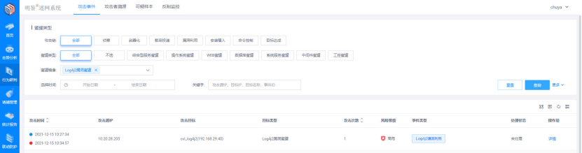 當(dāng)攻擊者踩到部署的 Log4j2漏洞蜜罐,即可在迷網(wǎng)的“攻擊事件”頁(yè)面查看記錄的攻擊行為、在“攻擊者溯源”頁(yè)面查看攻擊者相關(guān)信息,從而輕松定位攻擊者。