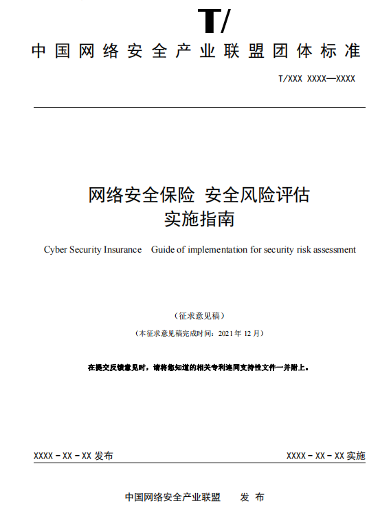 2021年12月24日,中國網(wǎng)絡(luò)安全產(chǎn)業(yè)聯(lián)盟發(fā)布通知,由杭州安恒信息技術(shù)股份有限公司牽頭制定的《網(wǎng)絡(luò)安全保險 安全風(fēng)險評估實施指南》聯(lián)盟標(biāo)準(zhǔn)已完成征求意見稿,進(jìn)入為期一個月的征求意見階段。