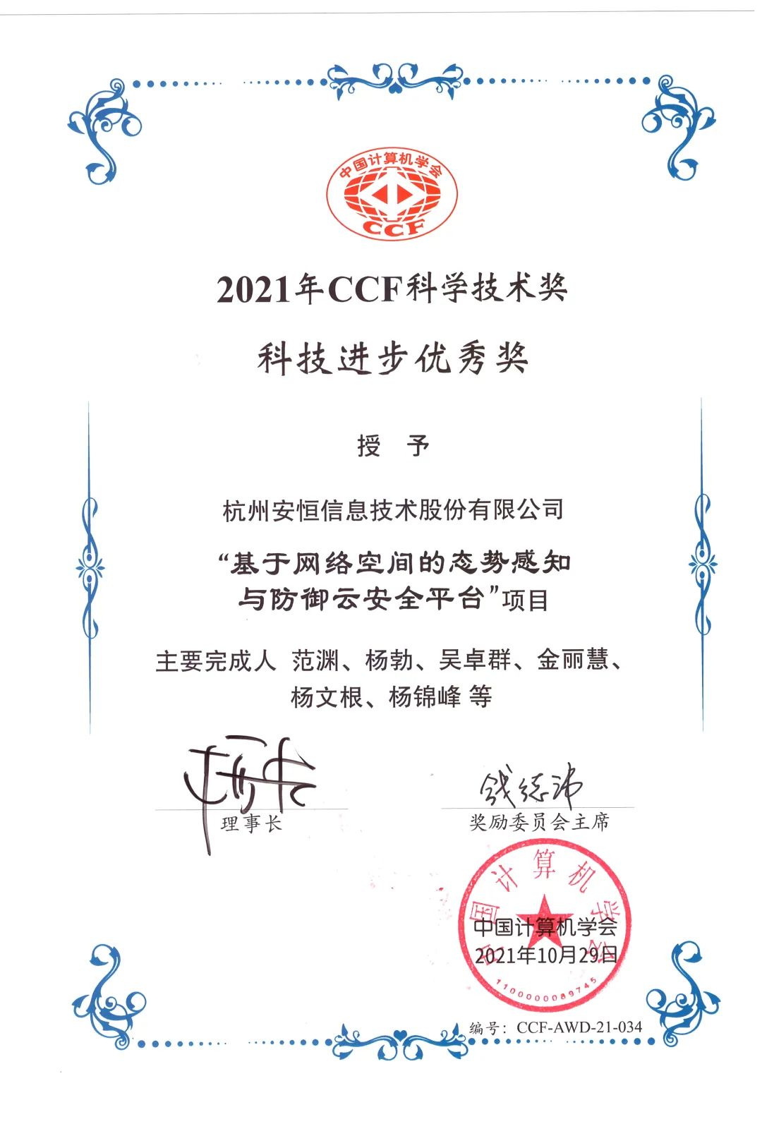 安恒信息榮獲“2021年CCF科學(xué)技術(shù)獎(jiǎng)科技進(jìn)步優(yōu)秀獎(jiǎng)”