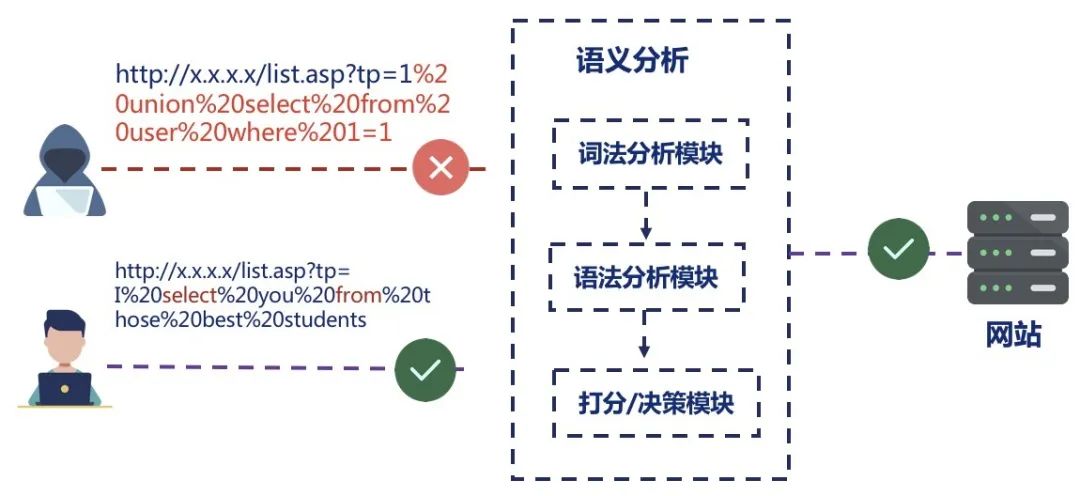 新一代智能WAF語(yǔ)義分析引擎采用智能識(shí)別、分析研判、綜合評(píng)估相結(jié)合的方式,對(duì)攻擊行為進(jìn)行檢測(cè)、防御,內(nèi)置包括SQL注入、XSS、Webshell在內(nèi)的13種語(yǔ)義語(yǔ)法檢測(cè)類型。顯著提高0day檢出率,降低誤報(bào)率、漏報(bào)率。