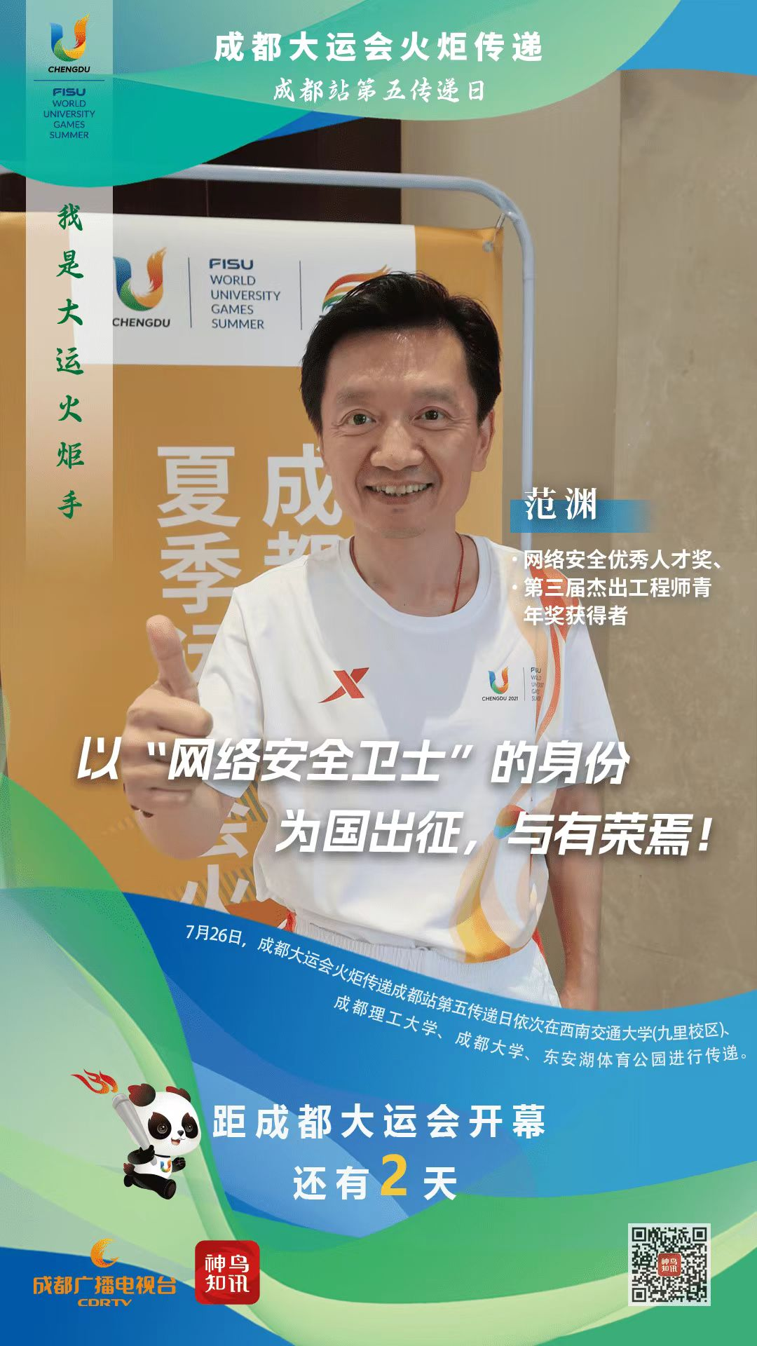 7月26日,成都大運(yùn)會(huì)火炬?zhèn)鬟f迎來最后一個(gè)傳遞日?!叭鼗稹蓖緩轿髂辖煌ù髮W(xué)、成都理工大學(xué)、成都大學(xué)三所高校后,傳遞至賽事主場(chǎng)館所在的東安湖體育公園,并舉行隆重的收火儀式。安恒信息董事長范淵作為第104棒火炬手在東安湖體育公園進(jìn)行接棒傳遞。