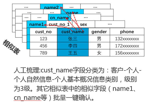 特性:采用無監(jiān)督的聚類算法,將相似字段/表聚合在一起實現(xiàn)信息整合;在梳理向導功能的輔助下,用戶僅需修改其中一項的分類分級信息,即可批量自動覆蓋其他相似字段/表的結果,提升人工梳理效率。聚類算法在AiSort的版本迭代中持續(xù)優(yōu)化,聚焦于提供更具實際業(yè)務描述能力的信息整合手段,讓梳理人員在盡可能短的時間內準確判斷當前字段的實際分類和實際分級。
