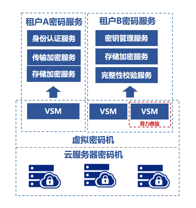 密碼服務(wù)能力的底層資源由云服務(wù)器密碼機(jī)提供,通過將各類密碼服務(wù)部署在虛擬密碼機(jī)VSM中,將VSM分配至指定租戶。相比于基于硬件的密碼資源池,這種技術(shù)路線實(shí)現(xiàn)了對(duì)專用密碼硬件的數(shù)量控制,同時(shí)租戶對(duì)密碼服務(wù)也具備更多的管理運(yùn)維功能,比較符合云計(jì)算虛擬化、彈性的建設(shè)思路。