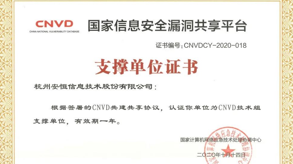 兩項榮譽 一項證書,安恒信息再次榮獲CNVD表彰