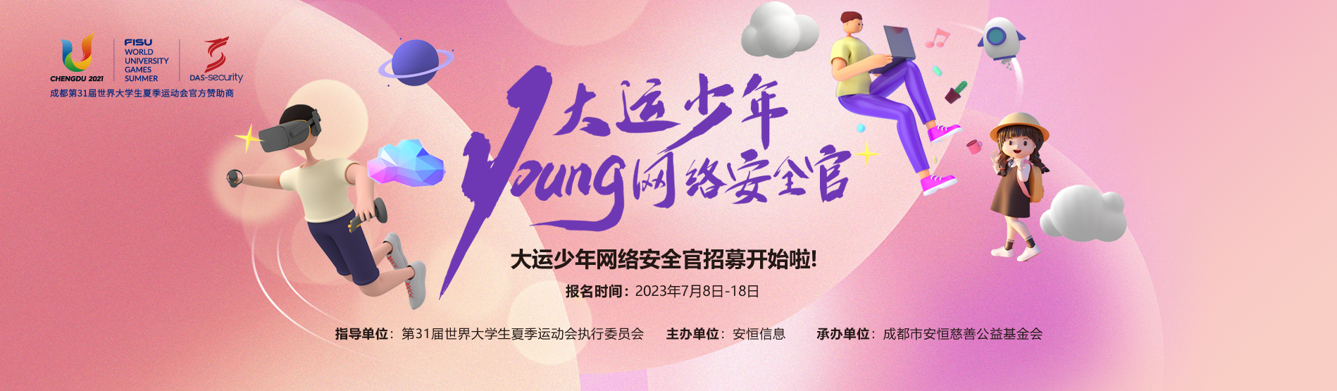 7月28日,第31屆世界大學(xué)生夏季運(yùn)動(dòng)會(huì)將在成都盛大開幕。這是疫情結(jié)束以來(lái),國(guó)內(nèi)首場(chǎng)開放性大型國(guó)際體育綜合賽事,也是全世界青少年交流學(xué)習(xí),展現(xiàn)風(fēng)采的平臺(tái)面。為全面貫徹黨的二十大精神,普及青少年網(wǎng)絡(luò)安全意識(shí)培養(yǎng),助力網(wǎng)絡(luò)安全人才培養(yǎng),構(gòu)筑數(shù)字經(jīng)濟(jì)網(wǎng)絡(luò)網(wǎng)絡(luò)安全屏障,推動(dòng)網(wǎng)絡(luò)強(qiáng)國(guó)建設(shè)。成都大運(yùn)會(huì)網(wǎng)絡(luò)安全官方贊助商安恒信息作為一家極具社會(huì)責(zé)任感的企業(yè),成立“成都市安恒公益慈善基金會(huì)”,積極響應(yīng)成都大運(yùn)會(huì)“綠色、智慧、活力、共享”的辦賽理念貢獻(xiàn)企業(yè)的力量,現(xiàn)面向全國(guó)各年齡段在校學(xué)生,發(fā)起的“大運(yùn)少年網(wǎng)絡(luò)安全官”公益行動(dòng),活動(dòng)積極踐行“責(zé)任至上”的核心價(jià)值觀,攜手成都大運(yùn),甄選優(yōu)秀網(wǎng)絡(luò)安全人才,助力實(shí)現(xiàn)大運(yùn)夢(mèng)想,傳遞大運(yùn)精神,傳播公益文化。