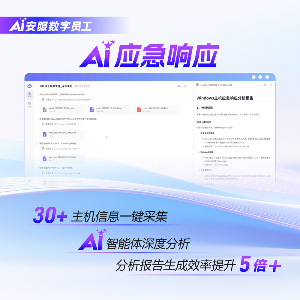 一鍵深度采集,實時威脅感知,精準(zhǔn)反APT,智能加固守護(hù),應(yīng)急響應(yīng)專家的數(shù)字分身!