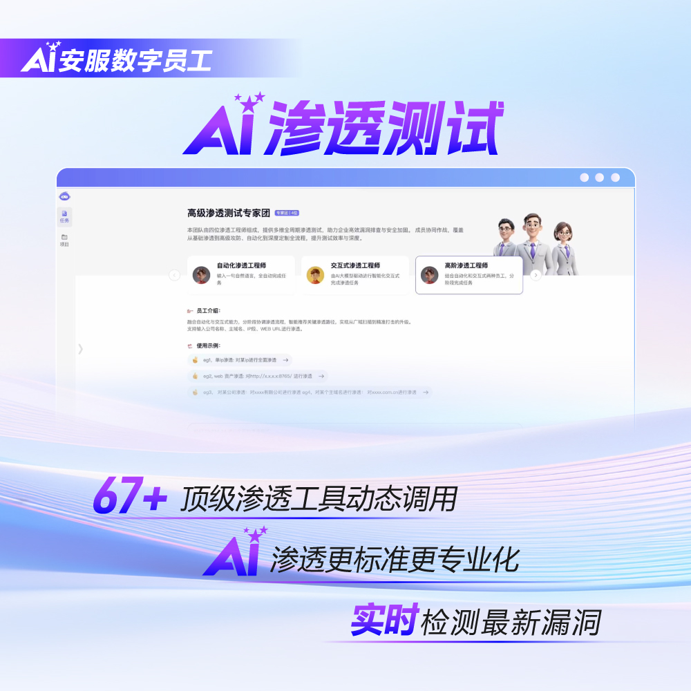 AI安服數(shù)字員工,讓安全服務(wù)從 "人工驅(qū)動" 邁向 "AI 自主",重新定義效率與精準(zhǔn)的邊界。即刻申請免費(fèi)體驗名額,填寫信息,7天免費(fèi)試用,獲取專屬安全服務(wù)方案!