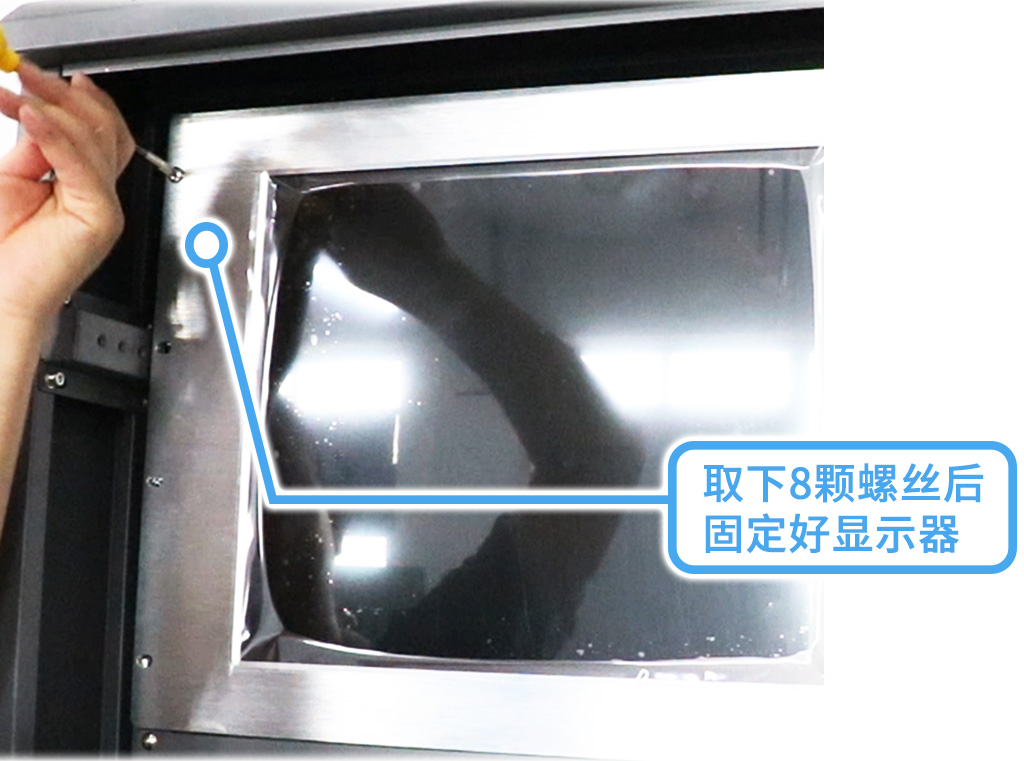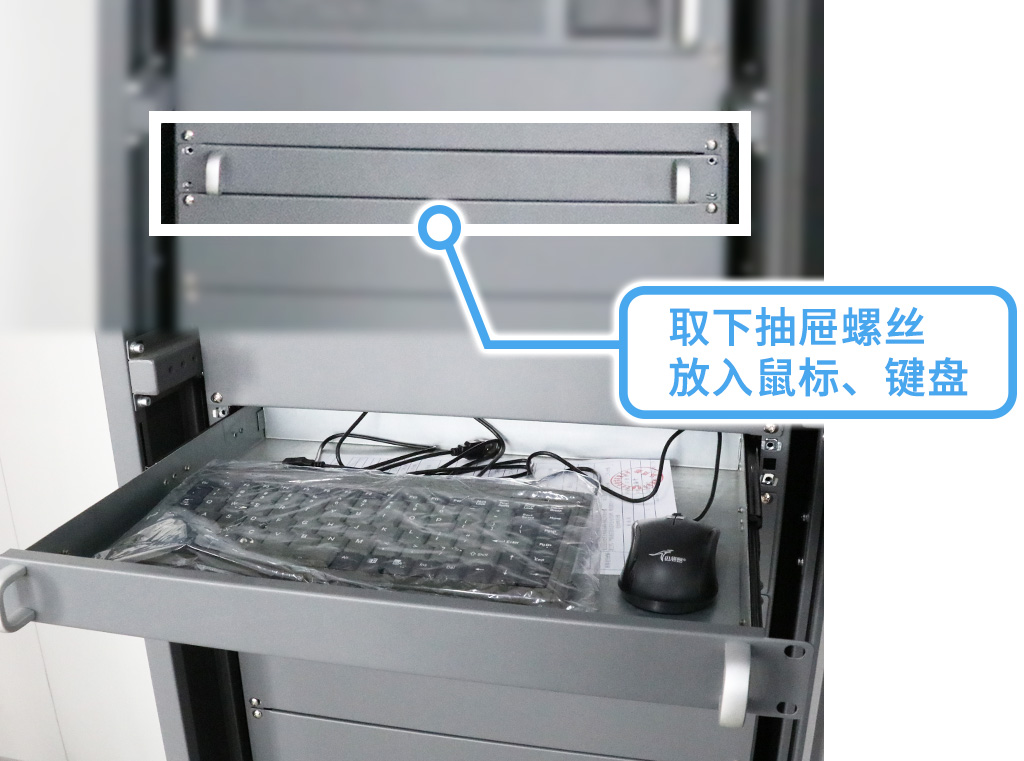 安裝主機前先取下抽屜螺絲,放置鼠標和鍵盤;再用工具固定好顯示屏8顆螺絲,然后翻轉(zhuǎn)到主機背面;