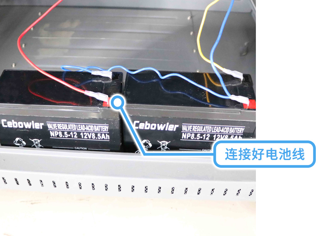 連接好電池線,兩節(jié)電池是串聯(lián)的,紅線接正,黃線接負,藍線接兩頭中間;